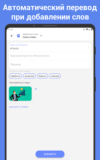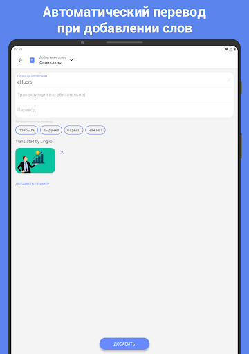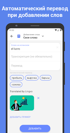 • Легко добавлять свои флеш карточки для запоминания слов: автоматически заполняются перевод, транскрипция, картинка и примеры.
