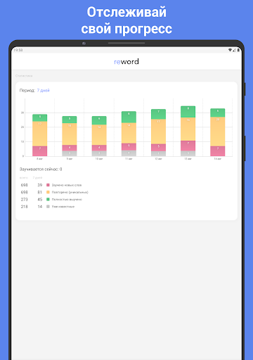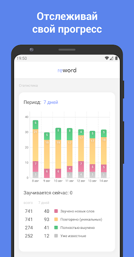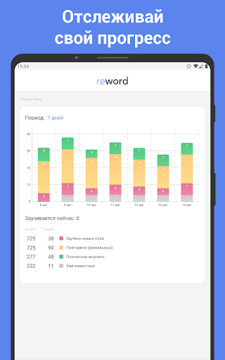 • Статистика обучения: отслеживайте запоминание слов за последнюю неделю, месяц, три месяца и год.