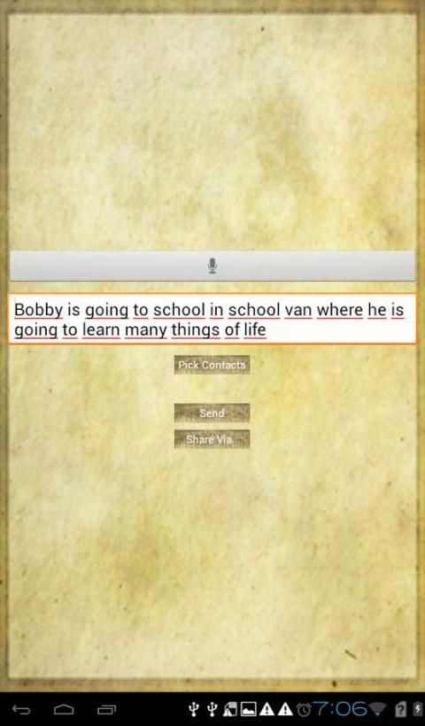 Речь в текст представляет собой простое приложение, которое может быть использовано в диктовать текст, который может быть отправлен в качестве SMS, электронной почте WatApps или в любое другое приложение вы подать в суд для социальных сетей / чат. Приложение использует Андроиды встроенные в речи устройства распознавания превратить речь в текст.