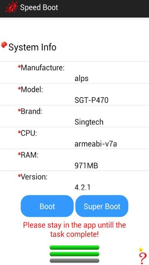 Скорость загрузки является приложение, которое может невероятно ускорить устройство и сэкономить Ваше время. Это будет чистой устройство и обновить Рам. Без того, чтобы перезагрузить каждый раз, вы просто открыть скорость загрузки и нажмите кнопку. Затем ваш телефон выпустит неважных задач и быть готовым к новой операции на полной скорости. Скорость загрузки может stablize и закрепите устройство в течение короткого времени и может поддержать большинство устройств с Android 2.2. с тщательно протестирован и создал. Это не бесплатно, никаких ограничений в использовании, не раздражает виджет, и нет тяжелых потребление батареи.