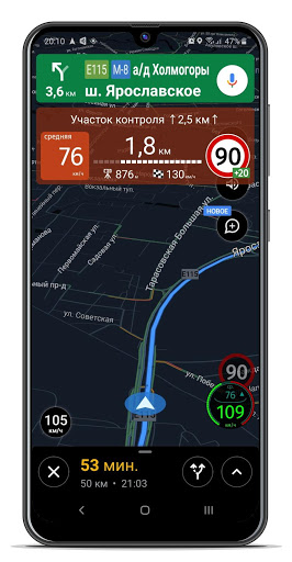 Контроль средней скорости на участках c указанием безопасной скорости (только для базы speedcamonline.ru). В базе есть информация о длине и траектории каждого участка контроля средней.