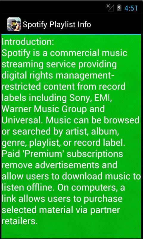 Spotify is a commercial music streaming service providing digital rights management-restricted content from record labels including Sony, EMI, Warner Music Group and Universal. Music can be browsed or searched by artist, album, genre, playlist, or record label. This app includes everything about Spotify. Also includede are some useful tips and tricks.