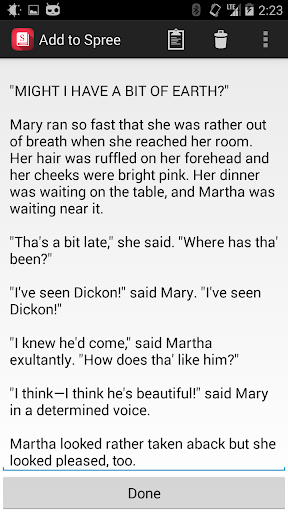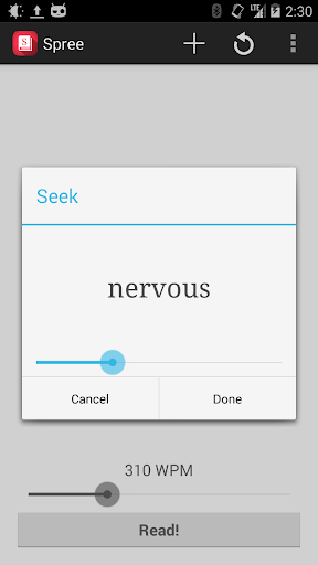 Spree helps you read your content faster by removing the need to move your eyes while reading. Just add your text, hit done and press 'Read'!