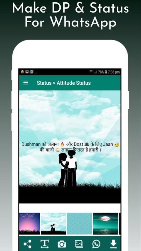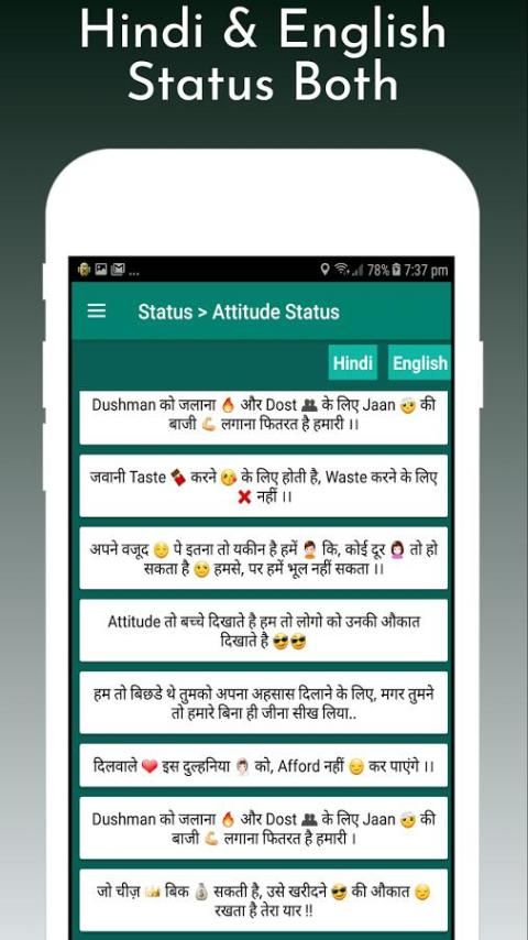 Attitude Статус на хинди. Все настолько убедительное, что вы будете приходить снова и снова, чтобы установить новый статус отношения в Hindi для WhatsApp и Facebook из этого списка. Мы собрали эти состояния, так что вам не нужно тратить время на поиск или вводить через Интернет для статуса отношения хинди для WhatsApp. Эта коллекция для мальчиков и девочек, чтобы определить их пожитки.