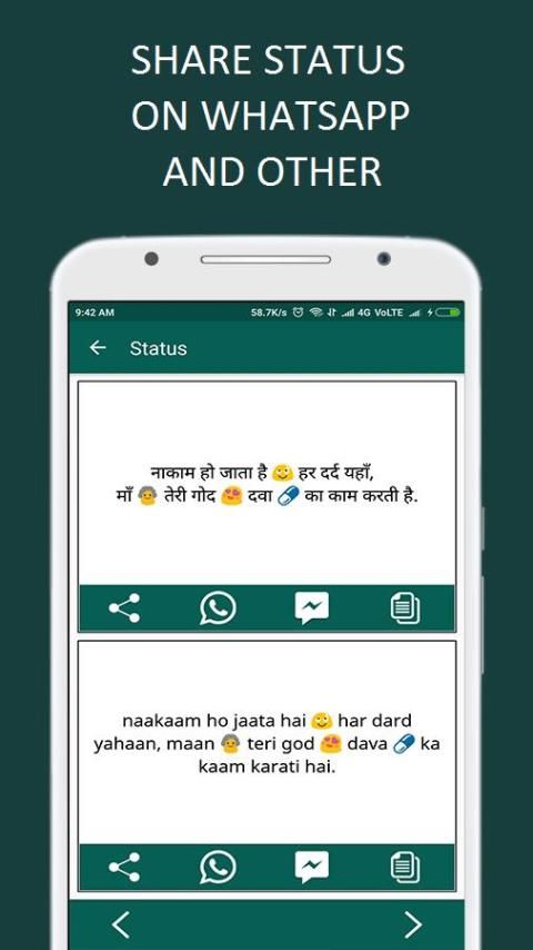 регулярно обновляется и дает вам ежедневную новую и свежую дозу последнего статуса для WhatsApp, Facebook, WeChat, Line, Viber, BBM и других социальных сетей. С легкостью удобство и качество хинди, английский Статус коллекции каждый стал экспорт статус.