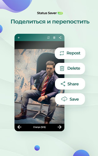 - Сохраняет любой статус из WhatsApp