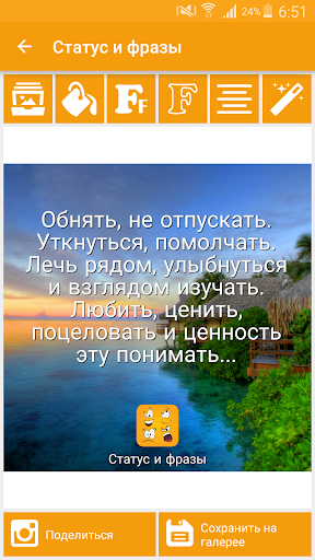 Вы можете создавать красивые изображения с статусов и фотографий и разместить его на Instagram, Whatsapp, Facebook, ВКонтакте и любой другой социальной сети.