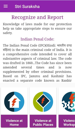 Приложение Stri Suraksha Подробности о том, как вы можете распознать и сообщать о насилии в отношении женщин в разных местах - дома, общественных местах, рабочем месте и киберпространстве;Узнайте о соответствующих законах и разделах, сопротивляющихся без ухудшения, вмешательства и восстановительного правосудия на основе сообщества.Также включены экстренные номера для отчетности и реинтеграции самостоятельных упражнений для восстановления.