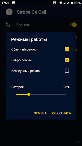 Можно установить минимальный уровень батареи для работы и длину вспышек.