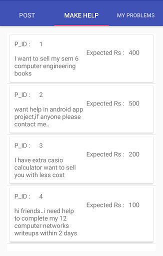 sell their old stationary with other needy student,student also can take/provide help in their projects or academics.Online student help system provide an interface which is easy to understand by users and greatly helps in adapting to use of this app.