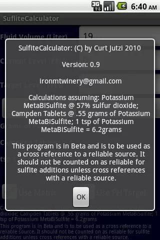 Simple Sulfite / Sulfate calculator to support home winemaking. Calculations assuming: PotMetaBiSulfite @ 57% sulfur dioxide; Campden Tablets @ .55 grams of PotMetaBiSulfite; 1 tsp of PotMetaBiSulfite = 6.2grams. This program is in Beta. It is to be used as a cross reference to a reliable source. Content rating: Everyone