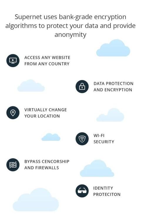 Supernet — это бесплатный VPN и прокси клиент, который работает быстро, просто и без ограничений. Всего один клик на экране, и VPN соединение запущено. Установи Supernet, чтобы: - Разблокировать любые сайты и контент, не доступный в твоем регионе (Spotify, Netflix, Hulu, Twitch, Pandora) - Защитить пароли, аккаунты и платежную информацию на своем устройстве от хакеров при подключении к Wi-Fi точкам - Скрыть свою онлайн-активность и IP-адрес от назойливых рекламодателей и недоброжелателей - Обойти фаерволы на работе и учёбе С VPN и прокси от Supernet у тебя всегда под рукой быстрый и надежный способ использовать Интернет на все 100% — свободно и безопасно. Поддержи идею безопасного и свободного Интернета — присоединяйся к нашему сообществу в социальных сетях: VK: https://vk.com/supernet_io Facebook: https://www.facebook.com/supernet.io Twitter: https://twitter.com/Supernet_io Есть вопросы? Пиши сюда: https://supernethelp.zendesk.com/hc/en-us/requests/new