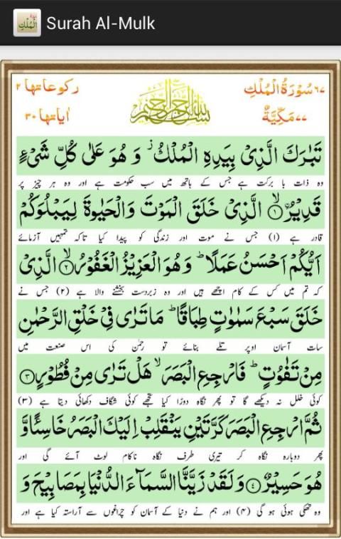 Сура Мульк написано в коранических шрифт с Quranic стиле подсветкой арабского текста и глаз ловить цветов. Урду перевод Хазрат Маулана Ахмед Али Лахори. Арабский текст намного больше, так что каждый может легко читать.