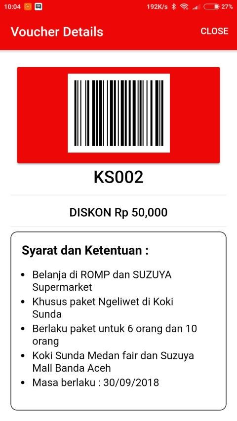 Show your E-SCC in the SUZUYA Mobile App for every time you make any transaction throughout SUZUYA Superstore, SUZUYA Dept. Store, Outlet ROMP and Bonterra Outlet for a minimum transaction value of IDR 20,000 You will get 2 points (Superstore) and 6 points (Dept. Store) in multiples.
