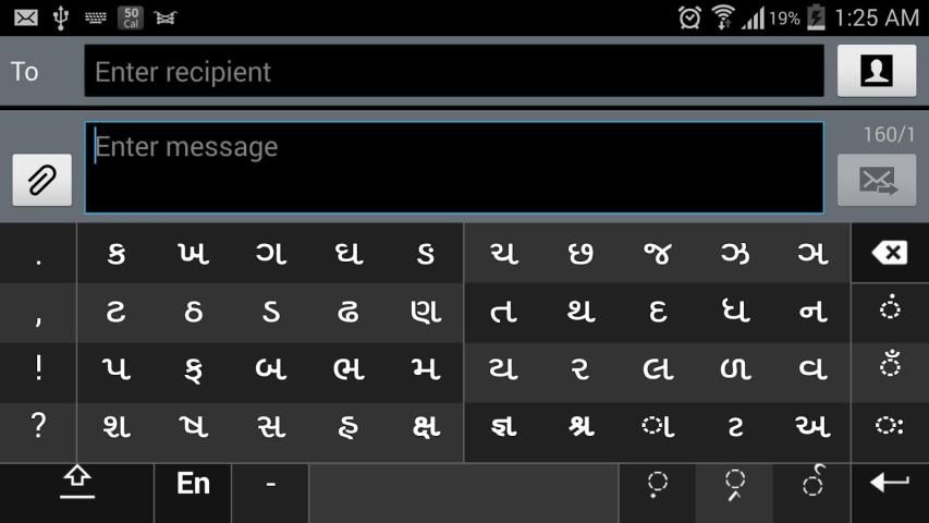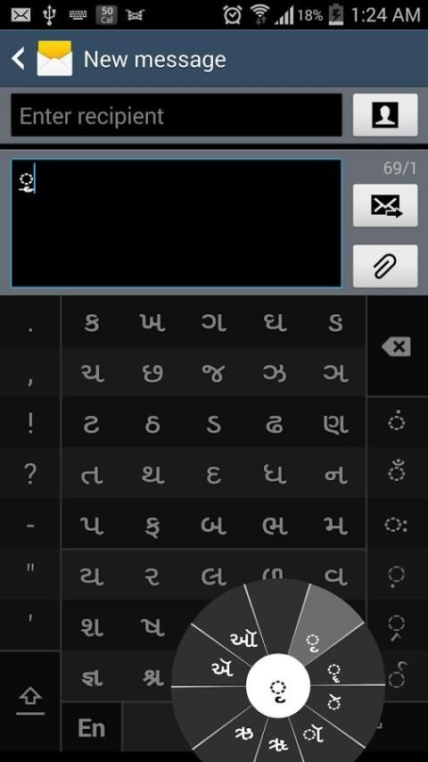гласные ( અ, આ, ઇ, ઈ, ઉ, ઊ, એ, ઐ, ઓ, ઔ ) появляются в отдельном чакры в правом нижнем углу. Менее используемые гласные и Матрас находятся рядом с ней ( ઽ, ઑ, ૃ, ઋ, ૄ, ૠ, ત્ર, ૅ, ૉ ). Цифры, символы и редко используемые символы отображаются на смену. Кроме того, можно переключиться на клавиатуре QWERTY временно вводить английскими символами.