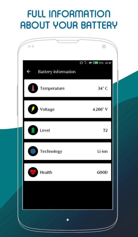 ✓ Подробная информация о батарее в главном экране приложения. Вы сможете увидеть процент энергии батареи, а также температуры в C °, напряжение батареи и, наконец, уровень.