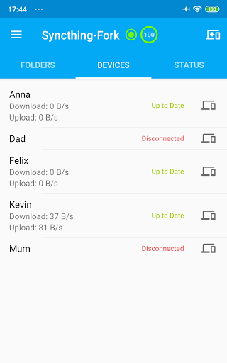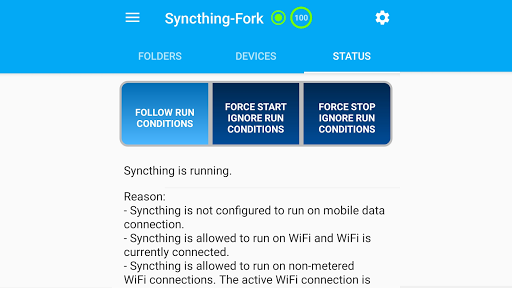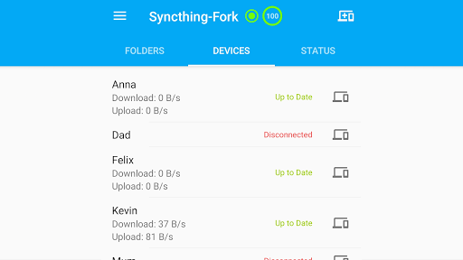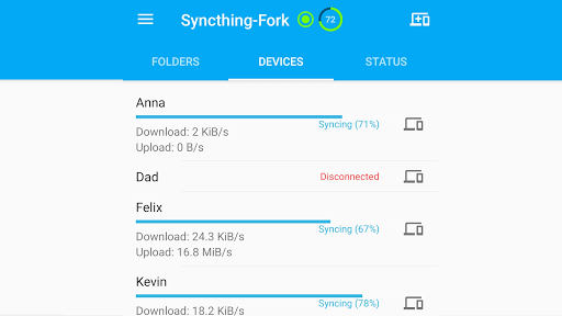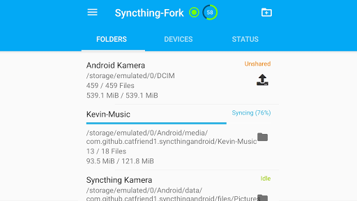 Syncthing-Fork для Android - это обёртка для Syncthing, предоставляющая интерфейс Android вместо встроенного в Syncthing веб-интерфейса. Syncthing заменяет проприетарные облачные сервисы чем-то открытым, достойным доверия и децентрализованным. Ваши данные - только ваши, и вы достойны решать, где они будут храниться, будут ли они доступны третьим сторонам и как они будут передаваться через Интернет.