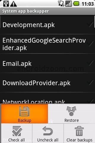 This app simply allows you to backup/restore system app of any custom rom like cyanogen one. Restoring NON NEEDED system apps on a different rom could cause FC!! Changelog: Added "Check all option"