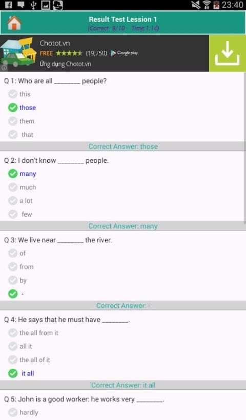 Каждый тест состоит из десяти вопросов, на каждый вопрос есть четыре ответа на выбор. В конце теста будет оценивать ваш счет достигнутого, то вы можете узнать из опыта и улучшить свои способности через каждый урока