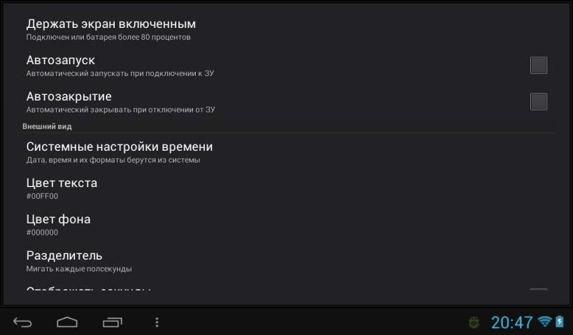 - возможность автоматического запуска и закрытия приложения при подключении и отключении от зарядного устройства (отключено в настройках по умолчанию)