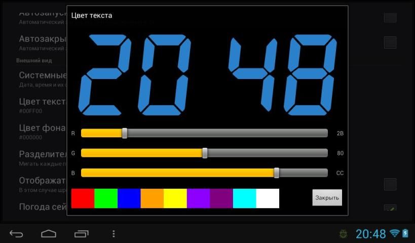 Если вы хотите уменьшить яркость еще меньше, чем позволяет ваше устройство, поменяйте в настройках цвета текста значения R, G, B на более низкие. Например если для зеленного(#00FF00) поставить 80 вместо FF яркость будет в 2 раза ниже.