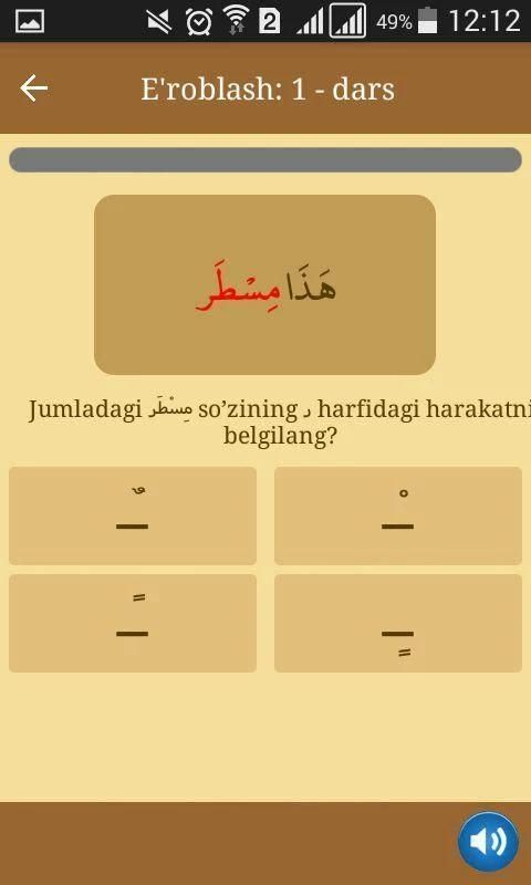Эъроблаш — Араб тилини ўрганишда сўзнинг охирги ҳаракатини қўйиш жуда муҳим ҳисобланади. Шуни ҳисобга олган ҳолда, иккинчи бўлимда бундай имконият тақдим этилди. Бу бўлим ҳам 52 дарсдан иборат бўлиб, билимларни мустаҳкамлашга ёрдам беради.