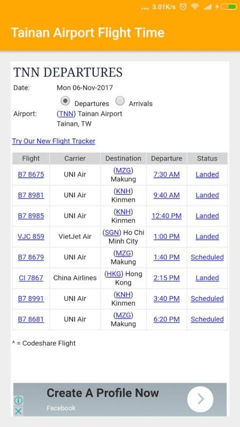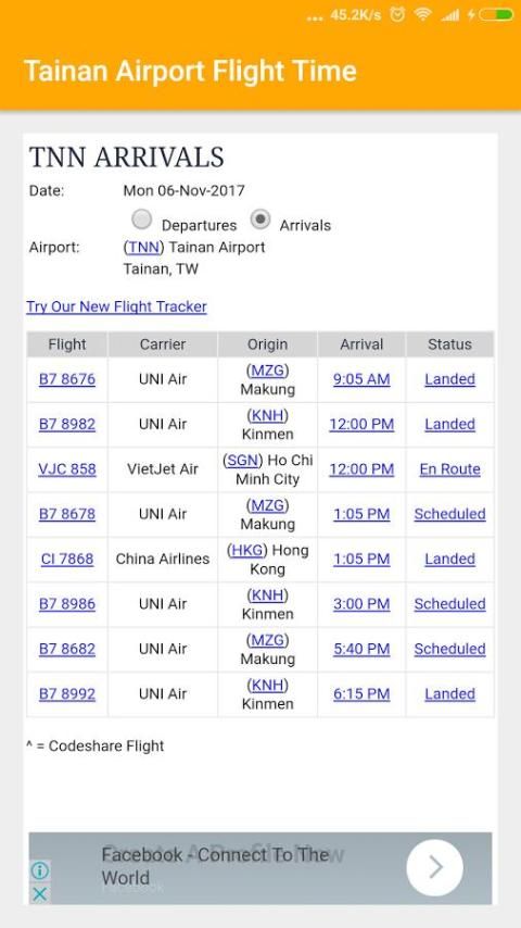 Тайвань, Тайнань Аэропорт Летные приложения Время. Получить Живая Прибытие Отъезд реального времени полетной информации. Международный и внутренний вылета рейса, рейс прибытия, номер рейса информацию из этого приложения. В режиме реального времени полетной информации. Кроме того, вы получите полета приземлился, задержки, отмены, сведения о расписании из этого приложения.