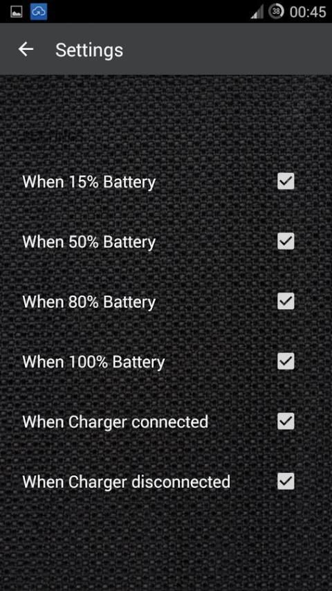Говоря Battery Meter Сигнализация будет сообщать вам о состоянии батареи, когда зарядное устройство USB зарядное устройство связано или выключенным. Это так же показывает вам состояние батареи, батареи полностью или низкого уровня заряда аккумулятора. Выберите выбор в настройках о состоянии аккумулятора или зарядного устройства эвакуированного и связанного. Empower Звук Talking батареи, приложение будет объявить, когда полномочия.