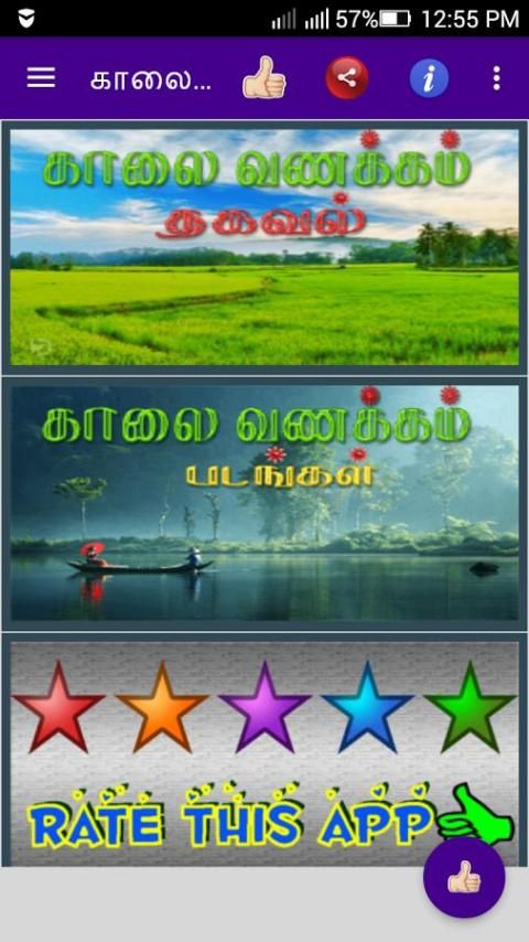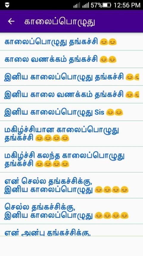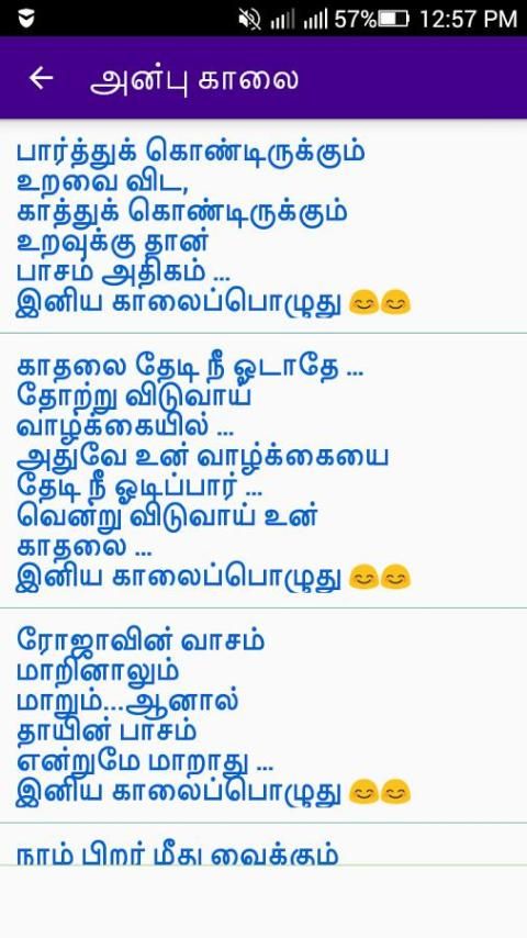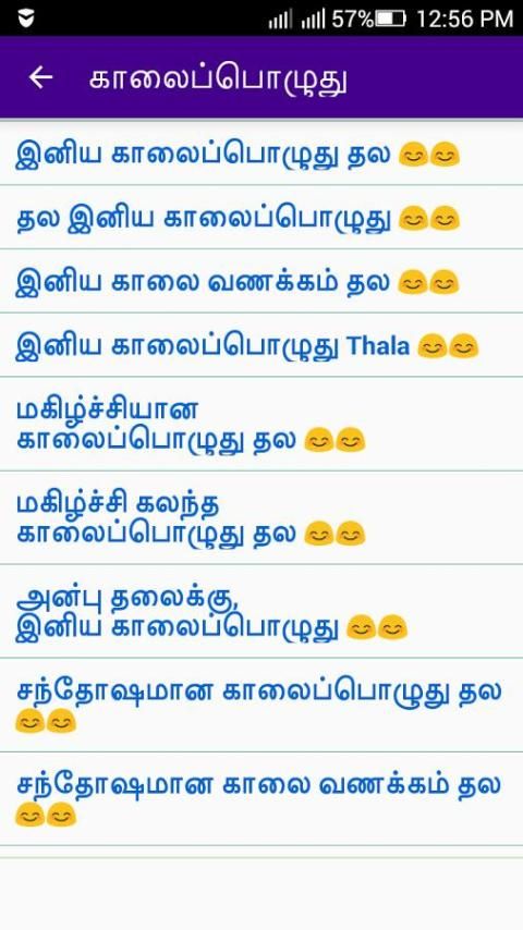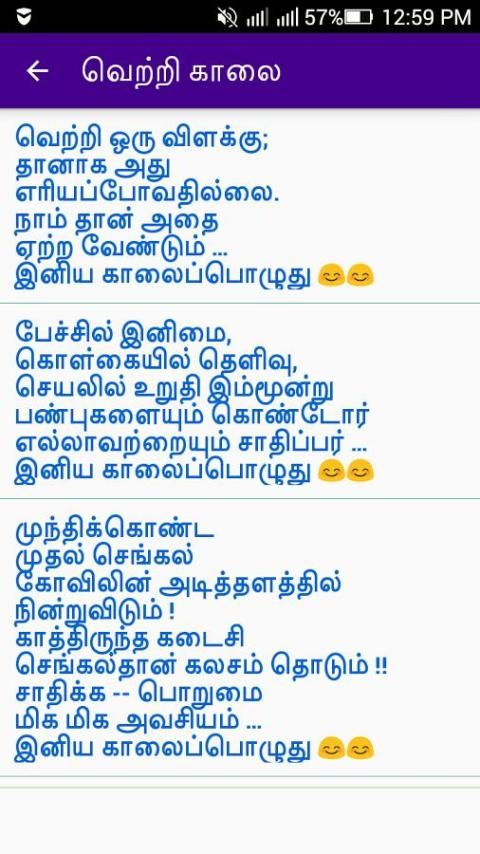 Сделать Доброе утро не просто слово, а желание достойную оплату ваших близких, чтобы установить позитивный тон для остальной части дня. Это приложение помогает в распространении оптимистичные флюиды с одним щелчком мыши, где не жалеет о том, что не может быть достигнуто вчера, но в надежде на то, что может быть достигнуто в настоящее время. Ликования, полученный желая в нашем родном языке никогда нельзя выразить словами. "விடியும் என்று விண்ணை நம்பு முடியும் என்று உன்னைநம்பு" может быть великолепное желание передать ваше утро желает тоску души.