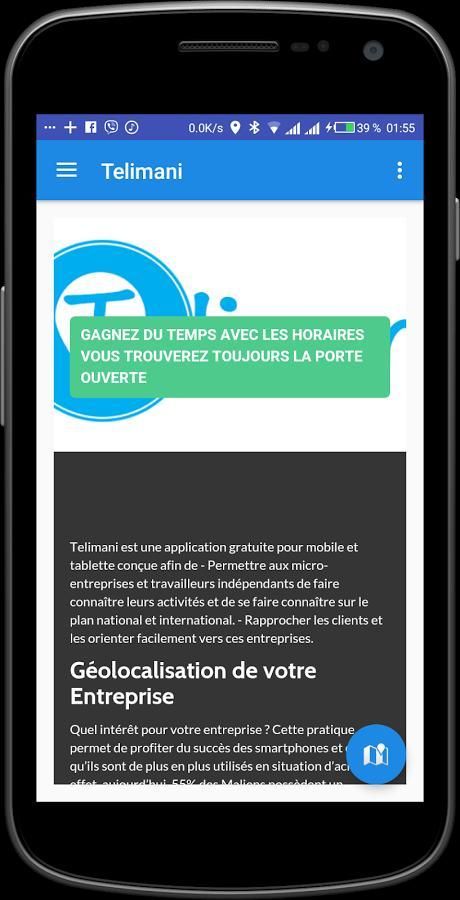 Telimani это бесплатное приложение для мобильных и таблетки предназначены для - Включение микро- и Entreprenneurs пропагандировать свою деятельность и стать известным на национальном и международном уровнях. - Привлечение клиентов и направлять их легко этим компаниям.
