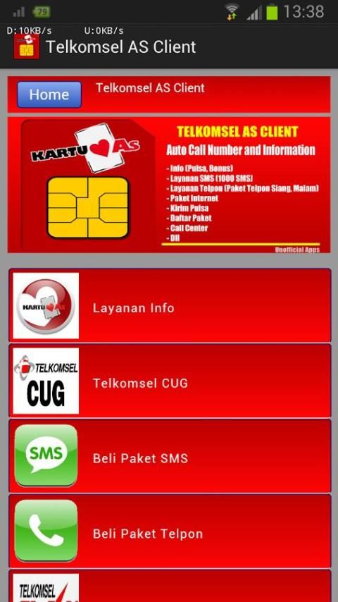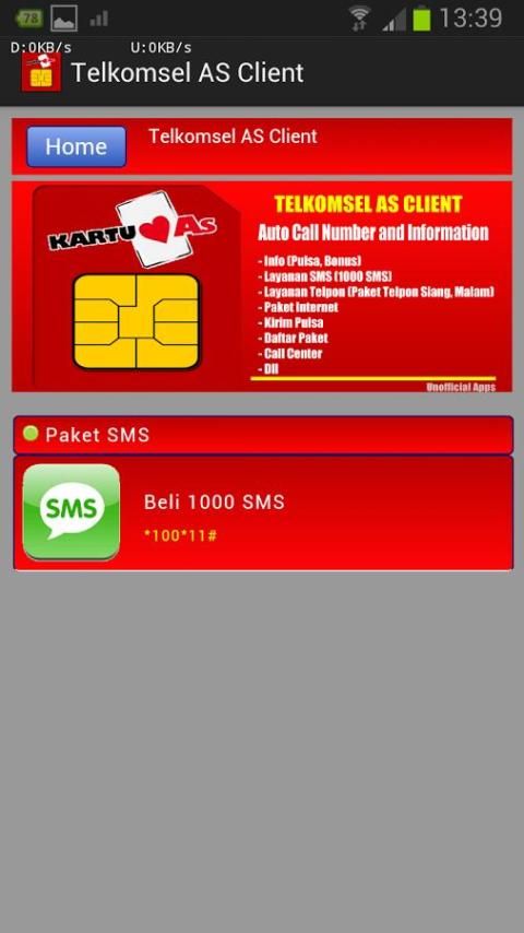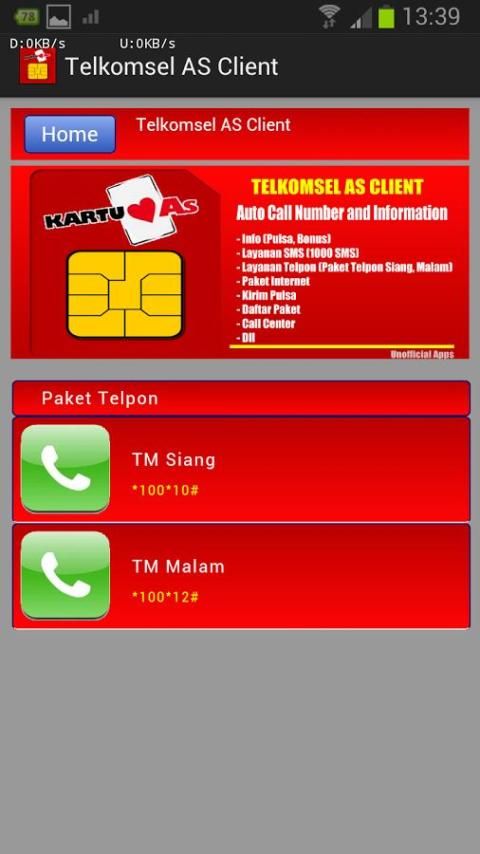 Приложение работает в автономном (офлайн-приложения) без доступа в Интернет, приложение доступно в системе в виде сочетания цифр - количество существующих услуг со стороны Telkomsel, который был настроен таким образом, что автоматический набор номера, бесплатный для вас.