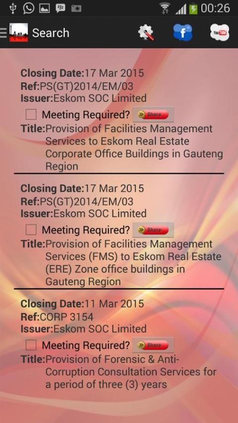 Поиск бизнес-тендеры, выпущенные в Южной Африке и обмениваться ими через социальные медиа. Вы можете искать по провинциям, промышленности и Тендерной истечения срока годности.