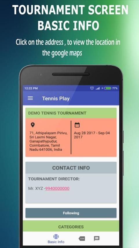- Поиск теннисных турниров на базе Tournament Название, Адрес и возрасту.