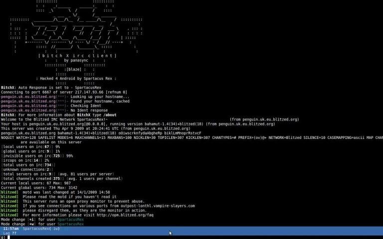 GCC 4.4.0, make 3.82, ctags, javac, java, dx, proguard, aapt, apkbuilder, signer, ssh, sshd, telnetd, bash 4.2, busybox 1.19.2, vim 7.3, nano 2.2.6, midnight commander 4.8, htop 1.0, TMUX 1.5, links 2.7, rsync 3.0.8, git 1.7.8, BitchX 1.1 and a nice terminal emulator are all available.