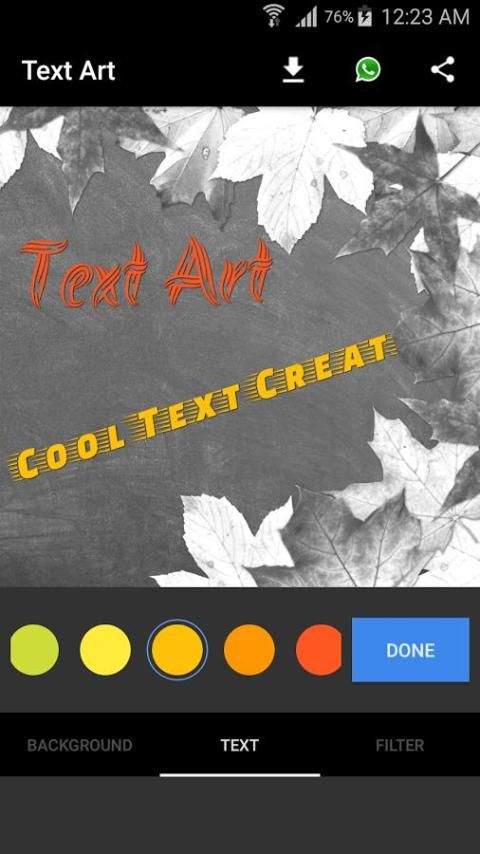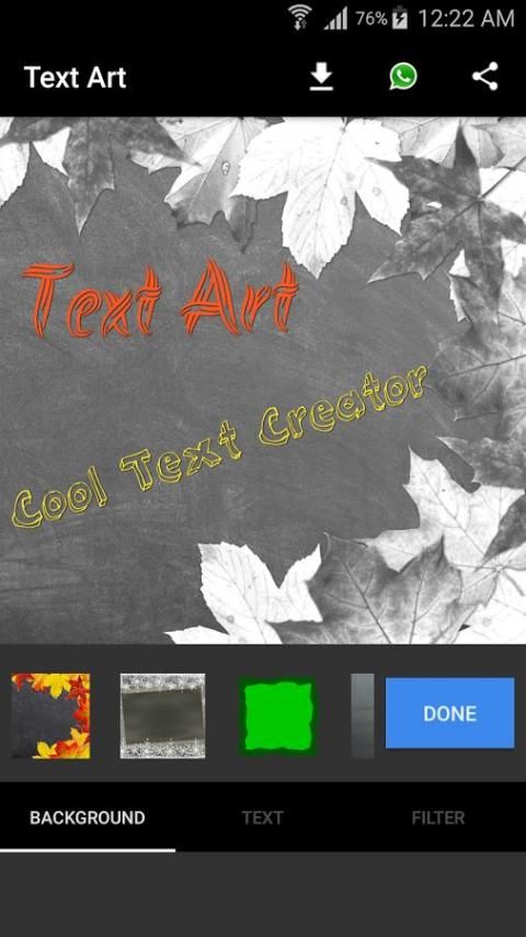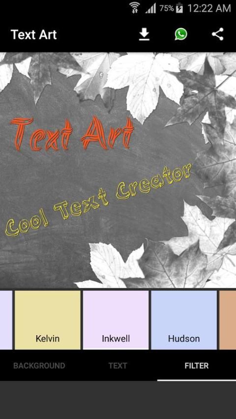 В меню ФИЛЬТР Text Art, можно отфильтровать текст искусства, созданный с красивым фильтром. Очень прост в использовании, только нажмите на фильтр, который вы хотите, и вы можете увидеть использованный фильтр мгновенно.