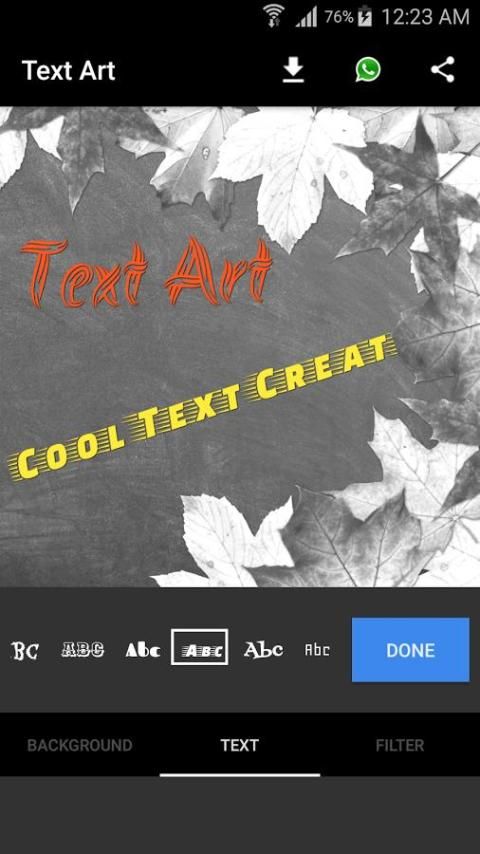 • с текстом искусства, вы можете поделиться своим искусством текста в социальных медиа, таких как Facebook, Twitter, WhatsApp, Skype, и т.д. с нажмите на значок общего доступа на топ приложений. Если вы выбираете долю социальных медиа, ваша фотография автоматически сохраняются в галерее вас и вы можете найти в папке Text Art.