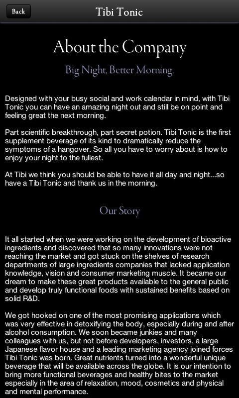 Indulge like there is no tomorrow and wake up like there was no last night. Tibi Tonic is a low calorie restorative elixir that prevents the effects of a hangover. It detoxifies, revitalizes and refreshes body and brain, so even if the details of last night are a bit… fuzzy, you’ll still wake up looking and feeling sharp.
