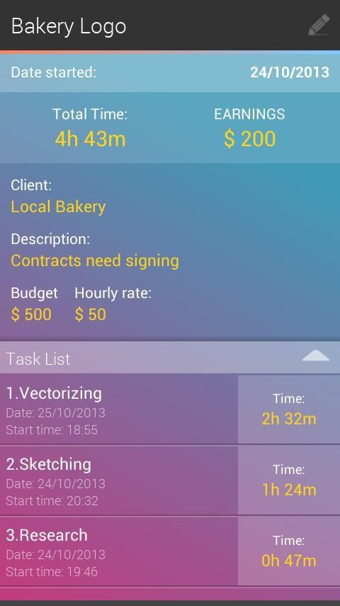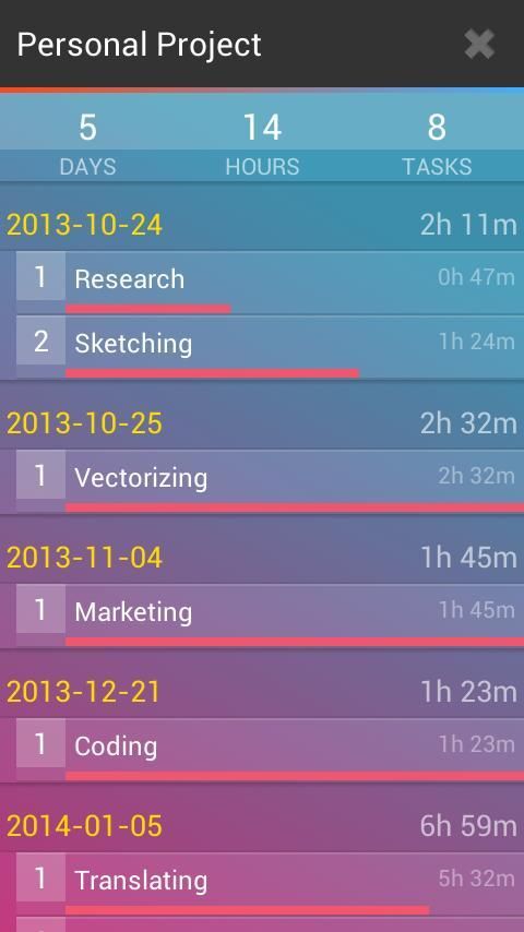 "TimeMachine" является расписания приложение для простого учета времени. Идеально подходит для фрилансеров, а также всех, кому необходимо отслеживать время, потраченное на работу над своими проектами, контролировать свое время, или просто хотите простую секундомер. Легко создавать задачи, измерять время, и назначить их проектов и клиентов. Нет необходимости в сложной конфигурации, просто нажмите на кнопку START, и вы можете начать запись времени. Особенности: - Отслеживание времени. - Простой, элегантный интерфейс - простой в использовании. - Управление проектами, задачами и клиентами. - Срок напоминания. - Прибыль расчета (на основе почасовой ставки) в выбранной валюте. - Вручную редактировать или введите время. - Резервное копирование и восстановление баз данных, - Экспорт данных в CSV. - Ежедневно, еженедельно и ежемесячно статистика. - Поддержка планшетных устройств. - Нет необходимости создания учетной записи и Войти.