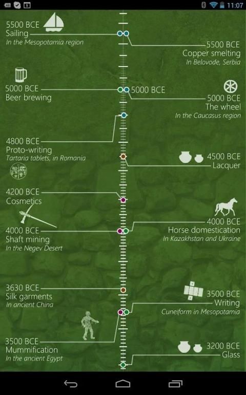 - Содержит комплексную схему значимых изобретений научно-промышленного, военного или навигационной природе на протяжении тысячелетий, от происхождения человека как вида в 2015 году
