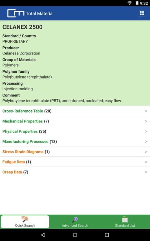 • Поиск данных для полимеров, композиционных материалов, волокон, керамики и многой другой в специальном модуле неметаллических