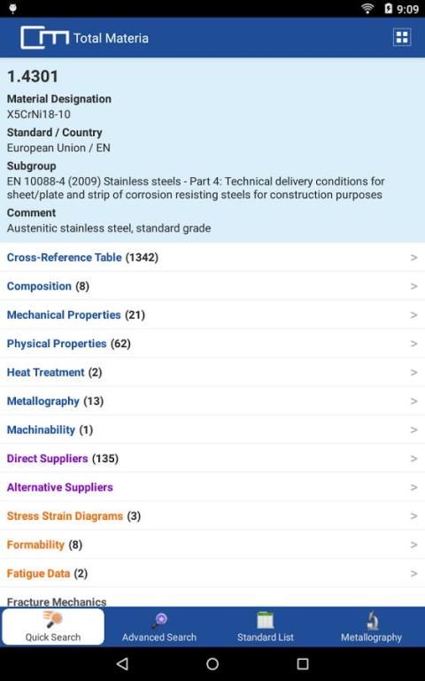 • Сенсорное доступ к> 450000 металлических и неметаллических материалов.