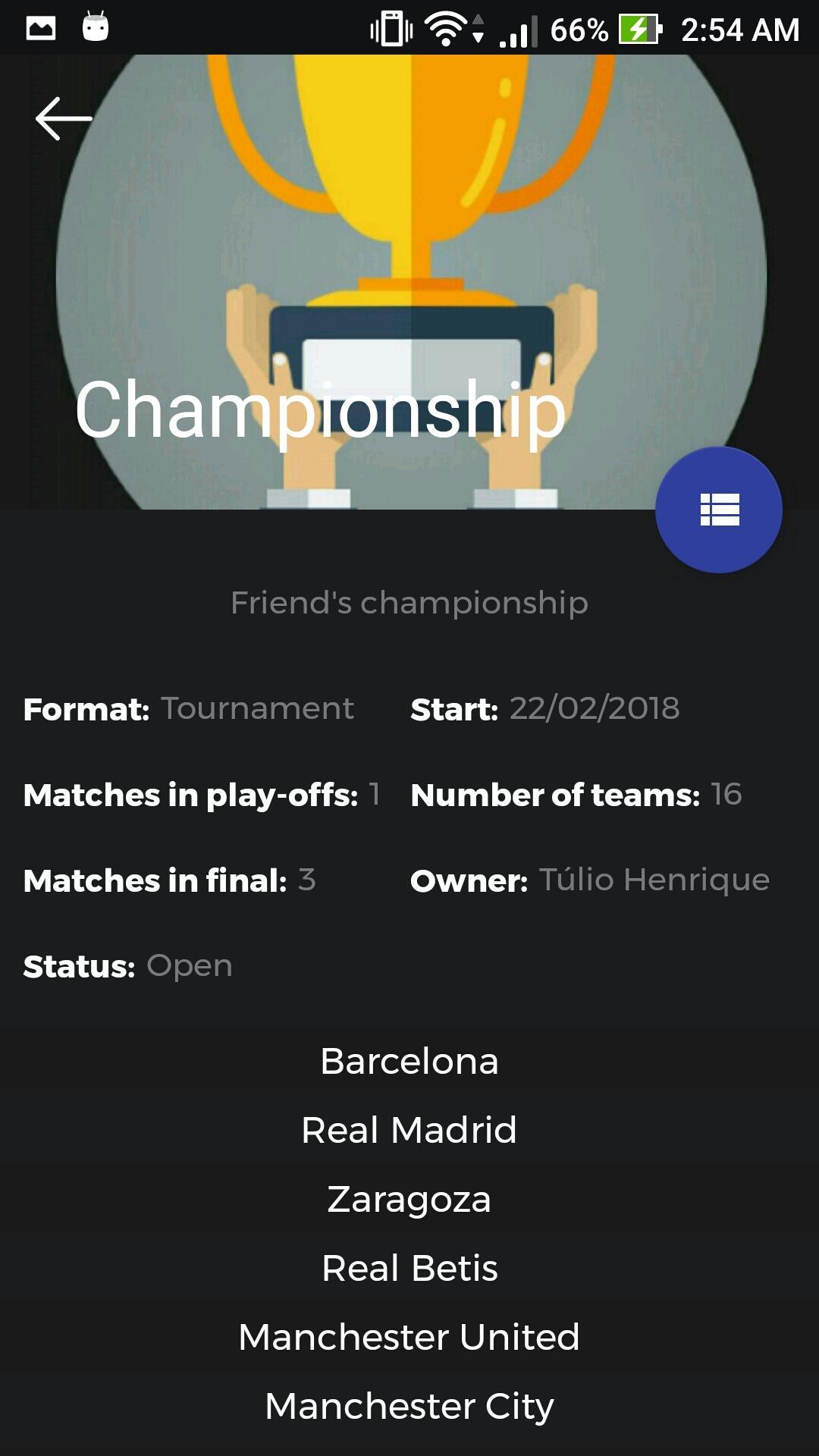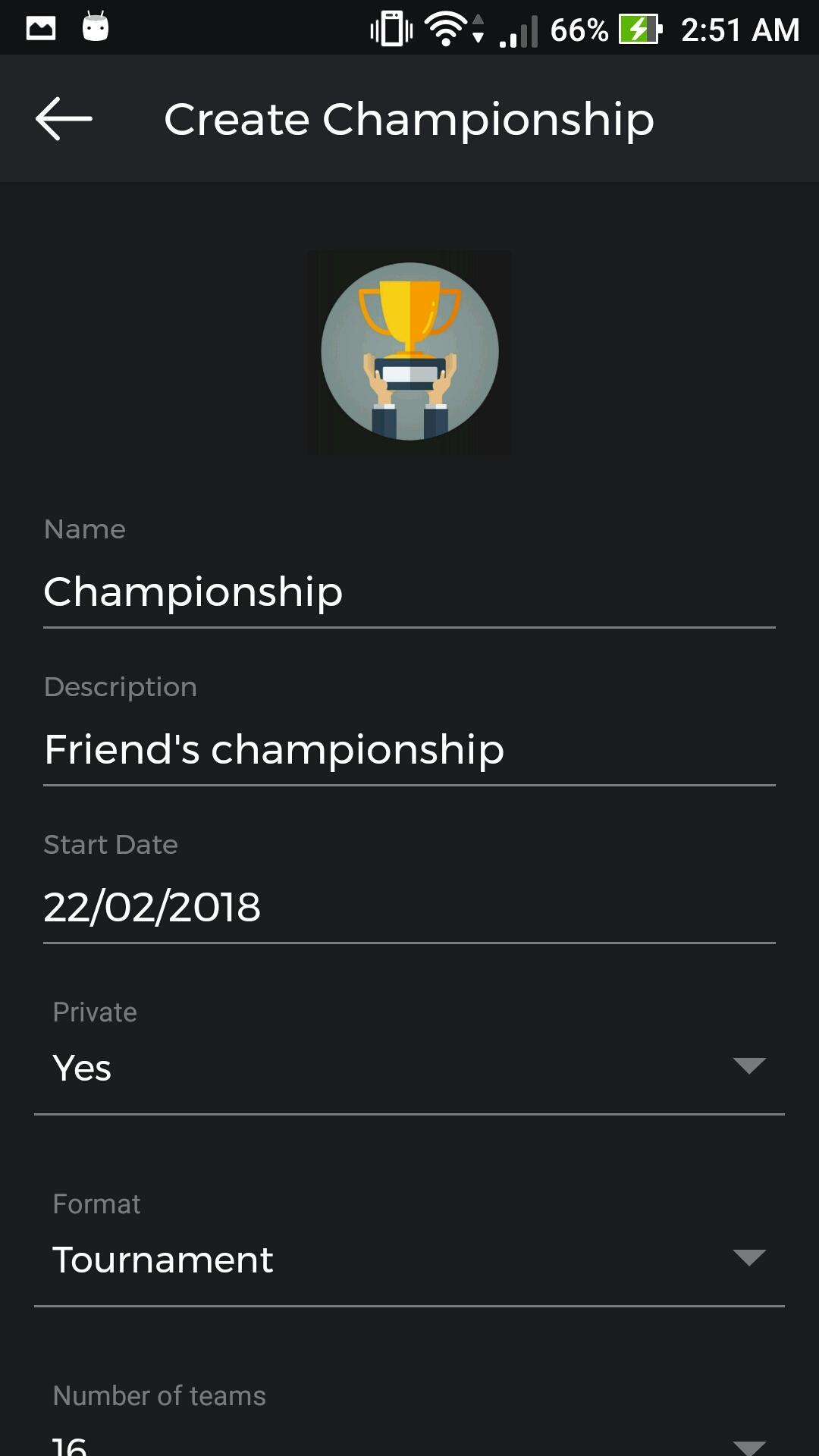 The first version of the app has the most common styles of championships, such as League, Cup and Tournament. Soon we will have more specific styles, such as the styles of e-sports championships.