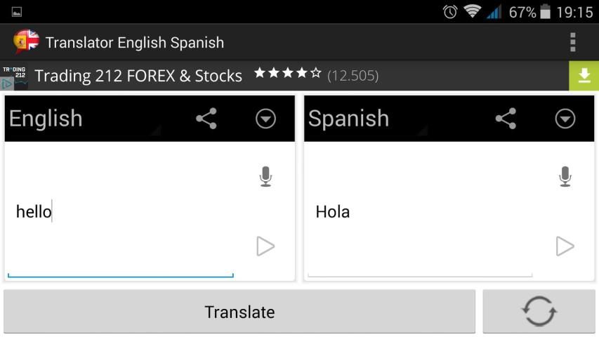 Переводчик Английский на испанском приложение в категории инструментов; Из-за многих нуждающихся в такого рода приложений в повседневной жизни, это переводчик позволяет переводить с английского на испанский и наоборот без ограничения переводов. Тем не менее, если вы, возможно, потребуется доступ в Интернет, чтобы сделать перевод, так что вы можете также воспользоваться приложением для улучшения произношения на английском языке, так как он имеет кнопку воспроизведения, который будет работать для вас текст переведенный на английский язык отлично. Мы ждем сотрудничества всех вас в качестве переводчиков для того, чтобы улучшить этот и любые другие приложения, которое является очень личное заявление, и мы уверены, что вы, что может дать нам хорошие идеи для реализации в приложении