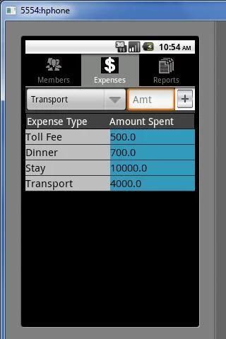5. Расходы Tab - Расходы Тип и сумма расхода может быть введен в этой вкладке. Нажатие кнопки меню даст возможность добавлять новые типы расходов и удалять существующие типы расходов. Длительное нажатие на любую из расхода в списке даст экран, на котором вы можете изменить тип расходов, сумму. Кроме того, настроить свой счет для конкретных пользователей.