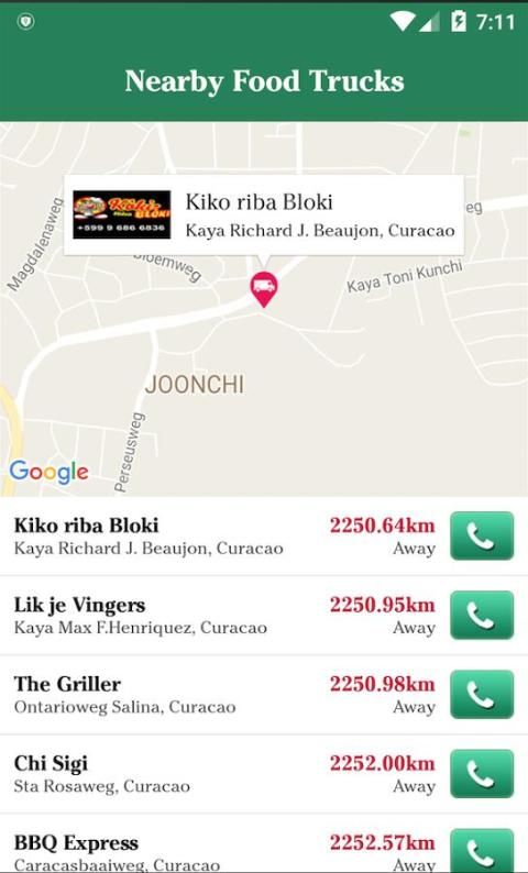 когда вы открываете приложение, вы увидите значок Food Truck и если вы касаетесь значок пищи грузовик на карте вы можете увидеть сайт, меню, День открытых дверей, время открыть телефонный номер и доставка годов.