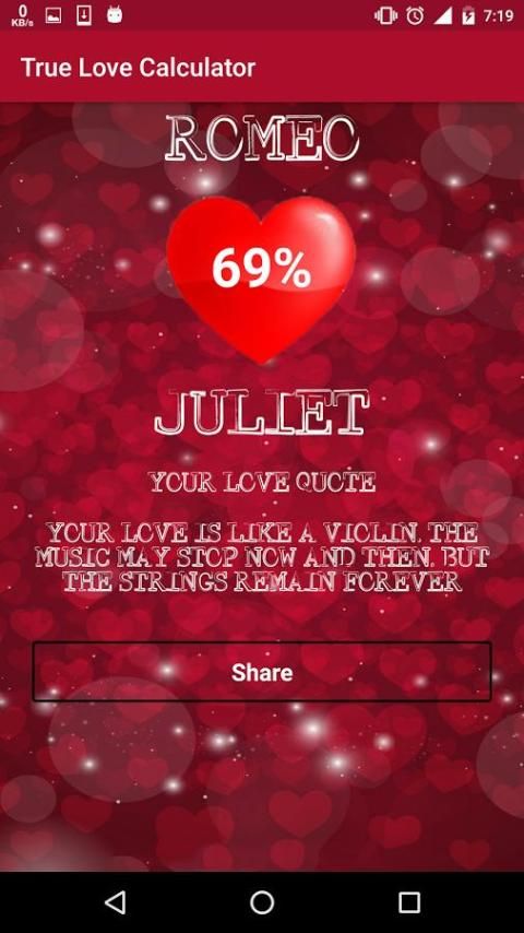 Проверьте свою любовь процент с вашей симпатичной один. Это приложение использует один из лучших алгоритмов, чтобы найти процент любви. Попробуйте это приложение один раз, я уверен, что вы не будете разочарованы.