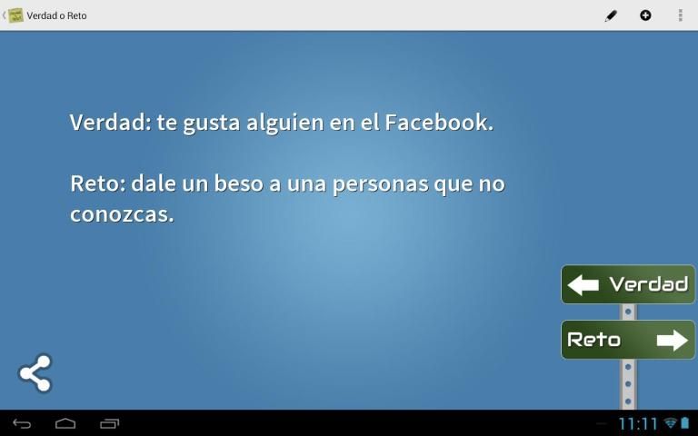 Los mejores retos para jugar entre amigos! Verdad o Consecuencia. Hasta donde te atreves a llegar? (+18) Los mejores retos para jugar entre amigos! Elíge responder una pregunta con sinceridad, o prepárate a cumplir los desafíos mas estúpidos! Ideal para jugar con amigos. Que los disfrutes! Explora los mejores desafios y compartelos con tus amigos por facebook, o juega cara a cara con ellos! tags: verdad, reto, verdad o consecuencia, juego de la botella, desafio [Web](http://frenys.com/322900655696-verdad-o-reto/?ref=Operadesc "Webapp") [Rss](http://frenys.com/322900655696-verdad-o-reto/rss.php?ref=Operadesc "Rss")