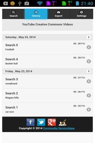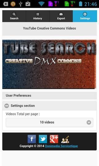 Description : -------------- On YouTube , Creative Commons videos (CC BY 3.0) are videos that you are free to : _ Share : you can copy and redistribute them in any medium or format _ Adapt : you can remix, transform, and build upon them for any purpose, even commercially ( The licensor cannot revoke these freedoms as long as you follow the license terms. ) Provided that you respect following terms : _ Attribution : You must give appropriate credit, provide a link to the license, and indicate if changes were made . You may do so in any reasonable manner, but not in any way that suggests the licensor endorses you or your use . More information are available : ------------------------------------- _ on YouTube website , at following address : https://www.youtube.com/creativecommons _ on Creativecommons.org website , at following address : http://creativecommons.org/licenses/by/3.0/ Tube Search Dmx Creative Commons is an app that allows you to display on your Smartphone or Tablet , YouTube Creative Commons videos , quickly and efficiently and to export their URLs via Gmail . . Features : ----------- You can refine your YouTube search with following filters : _ General filters : _ Videos duration ( "Short duration" , "medium duration" , "long duration" or "all durations" ) _ Videos quality ("Only HD videos" or "HD or Non HD videos" ) _ Videos within a specified period of time ( "Today" , "This week", "This month", "All time" ) _ Safe search ( "None", "moderate" or "Strict" ) _ A Specific author ( Youtube author name ) _ You can order YouTube videos by "Relevance" , "Date of publication", "Views count"or "Ratings" Each of your search is stored in a history , chronologically . You can restart each of them whenever you want You also have the option to export your search results using Gmail ( Provided that Gmail is installed on your mobile phone ) Finally, you can handle the maximum amount of videos you want to see in a results page, via Settings menu .. Author : --------- Copyright DONIMEDIA Servicetique David DONISA donimedia.servicetic@free.fr Support Forum : ------------------ http://donisocial.donimedia-servicetique.net/support-forum/?mingleforumaction=vforum&g;=6.0 Installation : -------------- Thanks to install Gmail to be able to export Urls of YouTube Creative Commons videos . Follow us on Social Networks : ---------------------------------- _ Facebook : https://www.facebook.com/pages/DoniSocial/260838887305566 _ Twitter : https://twitter.com/donisocial _ Google Plus One : https://plus.google.com/b/108757796091588173009/108757796091588173009/about?hl=en _ Donisocial Forum : http://donisocial.donimedia-servicetique.net/support-forum/ Requirements : ---------------- Android 2.3 and greater Advertisements : ------------------- To develop more free apps like Tube Search Dmx Creative Commons, we have implemented some ads in settings . Tube Search Dmx Creative Commons doesn't contain "NO motifications or icon ads" !!!