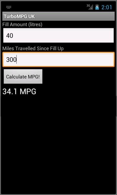 If you want to know how many miles you are getting for your money, using this app, you can find out in seconds. Firstly, reset your car's trip meter, and buy a full tank of petrol. Then, when you need to fill up again, buy another full tank. The amount you fill up with is the amount of fuel your car has used in this amount of time. Enter this, and the mileage on your trip meter, click the calculate button, and this app will reveal exactly how many Miles per Gallon (MPG) your car has done. Other MPG calculator apps may be more advanced, but this one is designed to be simple and fast, calculating your MPG quickly without you having to input your car's previous and current mileage, fuel cost, etc. PLEASE NOTE: This app uses Imperial Gallons, not US Gallons. If you use US Gallons, this app WILL NOT give the correct result.