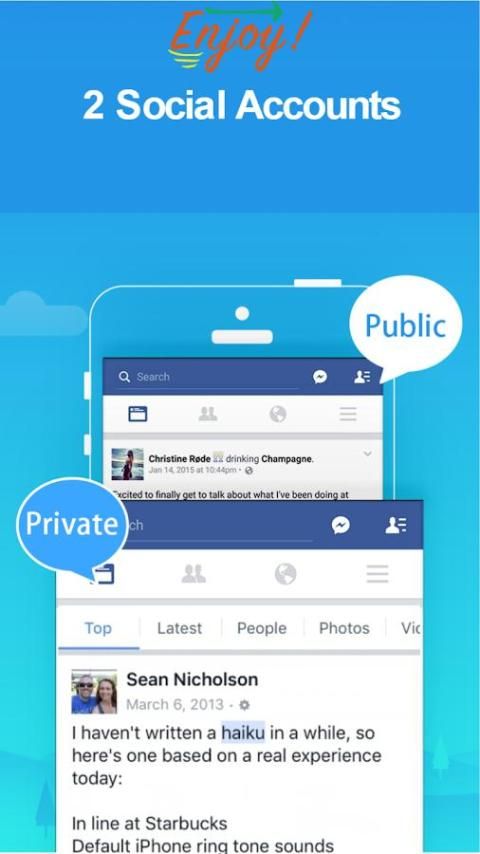 Вам нужно войти в систему для ваших различных учетных записей социальных сетей, в то же время? Вам требуется избегать войти снова и снова, чтобы проверить различные учетные записи? Хотите, чтобы сбалансировать вашу работу & личную жизнь? Близнецы Мульти счета создает клоны приложений и устанавливает их в безопасном виртуальном пространстве. Это позволяет создавать и запускать несколько учетных записей ваших любимых приложений на одном устройстве. Близнецы Мульти аккаунт позволяет войти в несколько аккаунтов в одном приложении одновременно. Вы можете клонировать и запустить любое приложение в двойне виртуальном пространстве. Все игры и приложения для социальных сетей могут быть клонированы. Ключевая особенность:- Можно легко добавлять новые учетные записи для входа в систему. Получите уведомления о ваших близнецов приложений. Два приложения могут остаться работать одновременно Легко Дифференцировать между реальным и двойной приложение Свободный и никаких ограничений на добавление приложений. Испытано на всех устройствах со всеми известными социальных сетей и игровых приложений Нет доступа & Root Регистрация Обязательный Уведомления: - Пожалуйста, добавьте Twins Мульти Учетные записи в белый список или исключительный список некоторых "повысить приложения", чтобы гарантировать, что уведомление о некоторых функций социальных сетей и приложения хорошо. Память:- Близнецы Мульти Счет сам по себе не занимает слишком много памяти, батарею и данные, по которым фактически потребленные приложений, работающих внутри. Подробности можно посмотреть в "Storage" и "Task Manager", который можно найти в панели управления внутри параллельного пространства. Разрешения: - Близнецы Мульти Счет должен применяться для разрешений, требуемых приложений, добавленных в Twins учетной записи, чтобы нормально функционировать. Например, если близнецы Мульти Счет не разрешается приобретать свое местоположение, вы будете не в состоянии послать свое местоположение своим друзьям в некоторых приложениях, которые работают в Twins Мульти счета. Близнецы Мульти счетов не собирает вашу личную информацию, чтобы защитить вашу частную жизнь. Предстоящие Особенности игры: - Частное приложение и приложение функции блокировки Туннель VPN для всех приложений, работающих внутри близнецов Мульти счетов. Таким образом, Добавить приложение и наслаждаться ею.